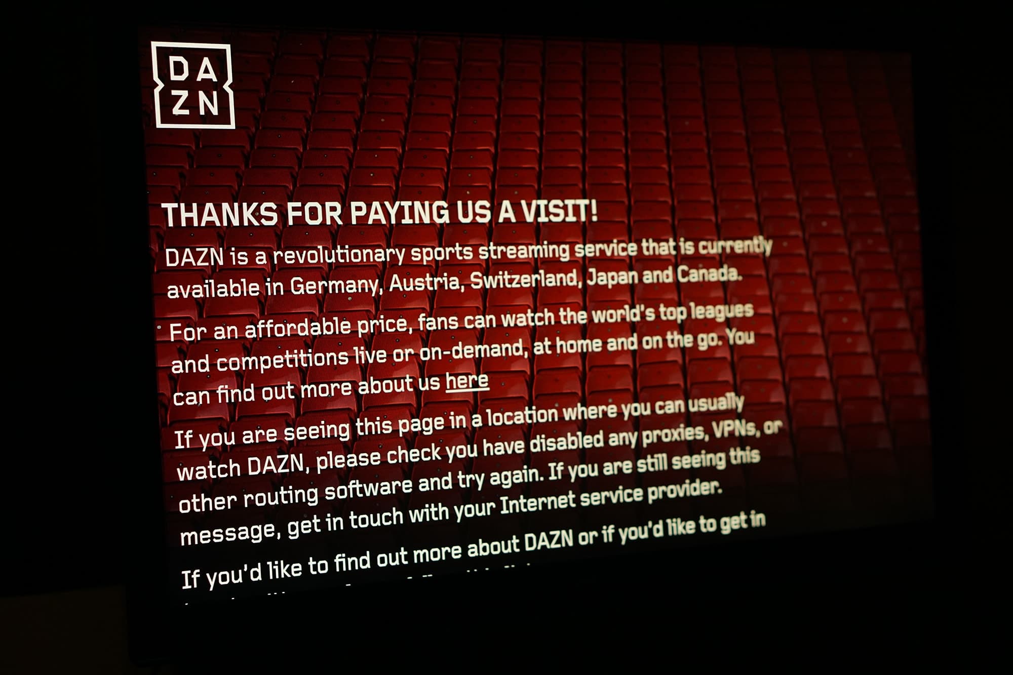 That’s why DAZN doesn’t just prevent certain locations from working, but it also prevents VPN services from working.