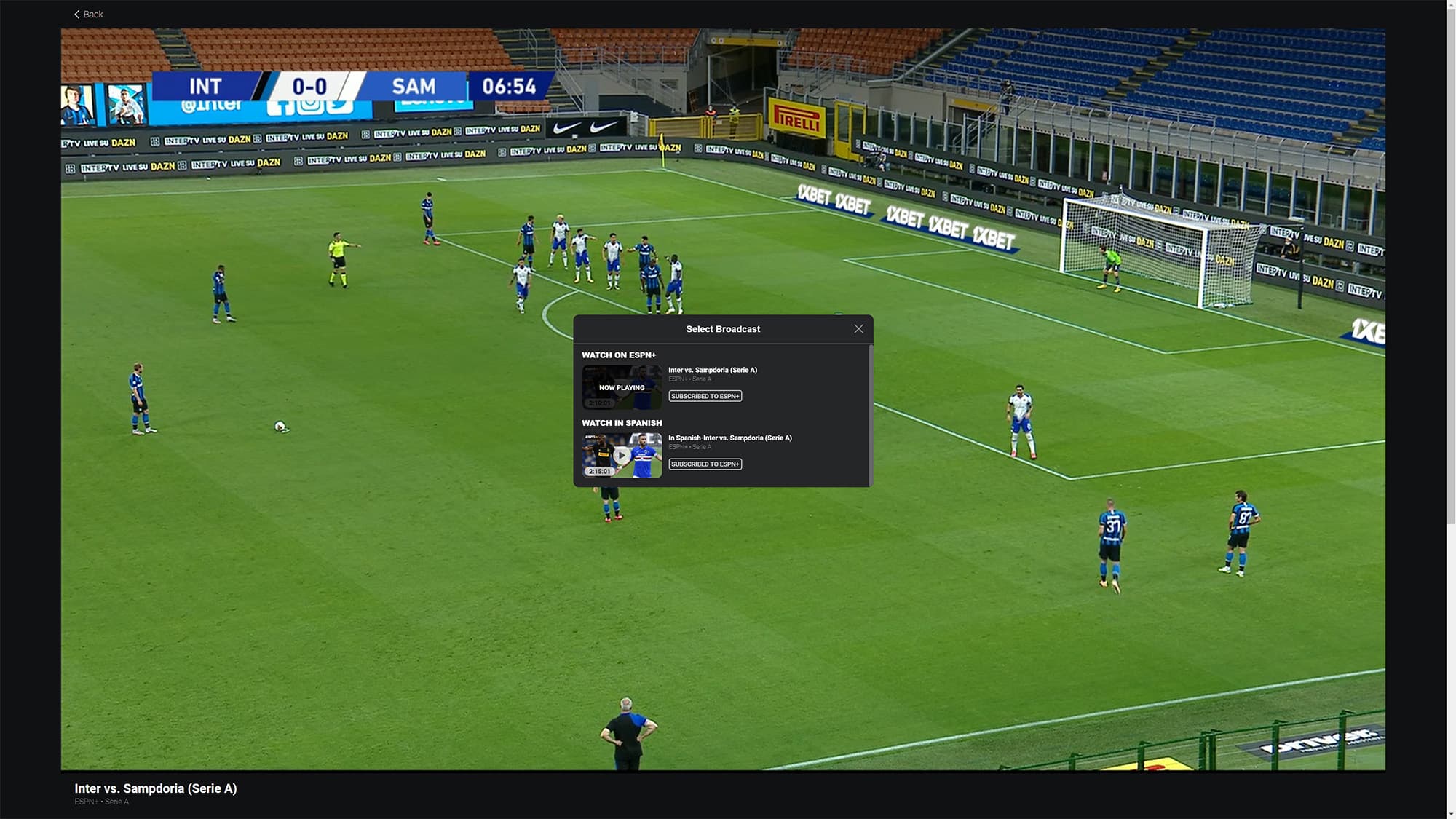 With ESPN+ open, select the event you would like to watch, and when on it, you will see a small camera gear at the bottom right. If you move your mouse there, you will see an option to choose your broadcast. Now, you will be able to change your broadcast to be in Spanish.