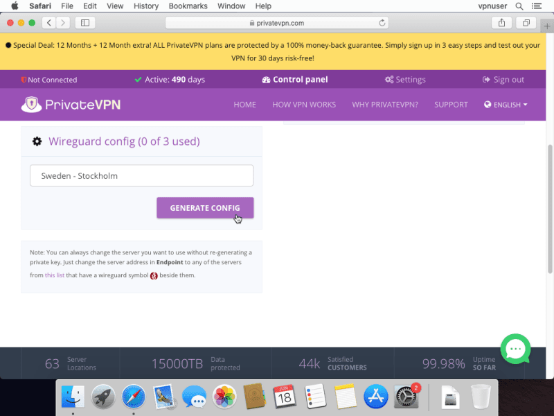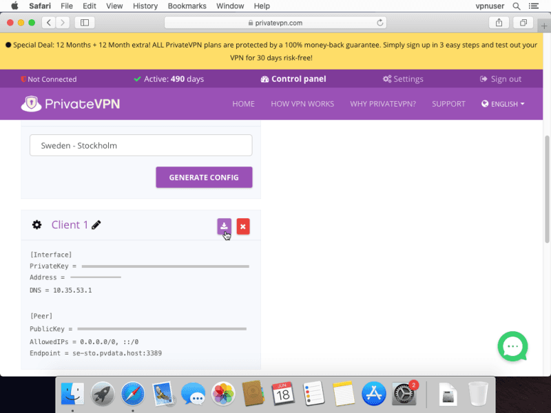 for this guide, we will select a Sweden-based server. Click Generate Config.