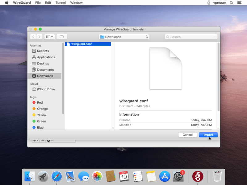 Select the wireguard.conf file that you have downloaded then click Import.