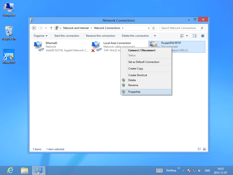 Right click on PrivateVPN PPTP and then click on Properties.