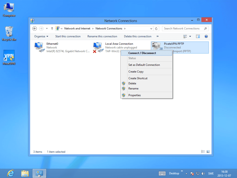 Right click on PrivateVPN PPTP and click on Connect / Disconnect.