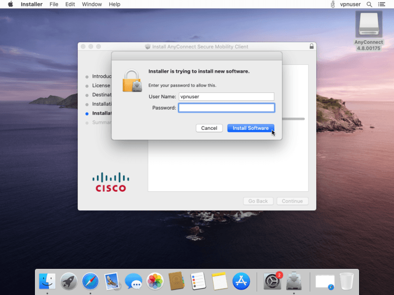 Enter your password for the Mac account (not VPN password) and then click Install Software.