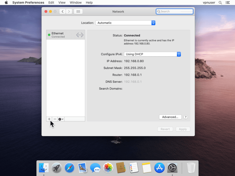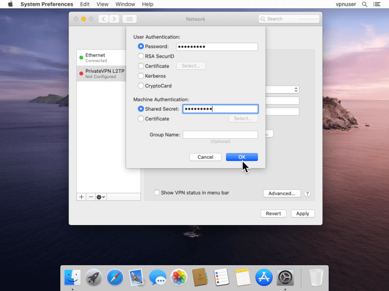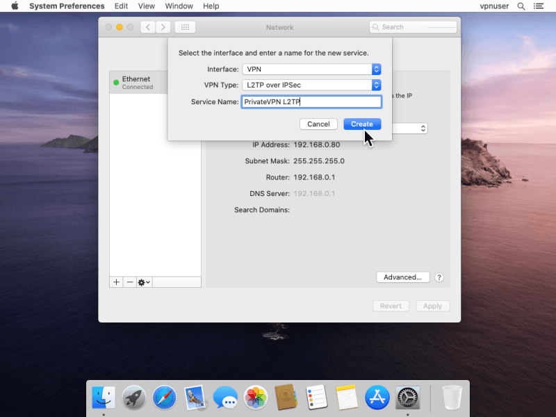 Set the Interface to VPN. Select L2TP over IPSec for VPN Type. Enter any name on Service Name. Click Create.