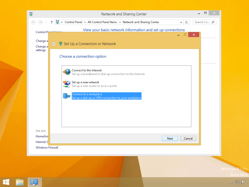 Choose Connect to a workplace and then click on Next.