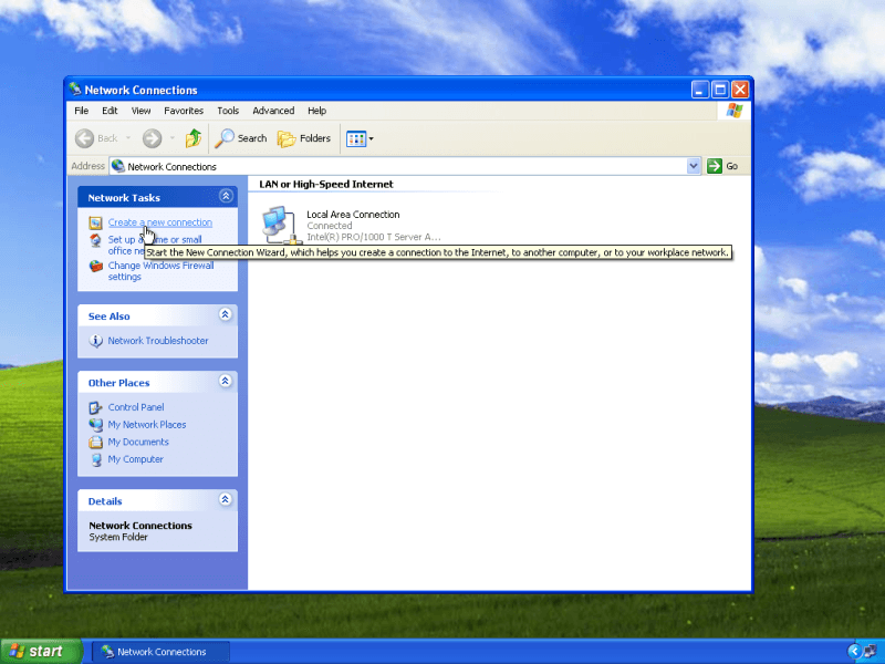 Click on Create a new connection option in the top left part of the Network Connections window.