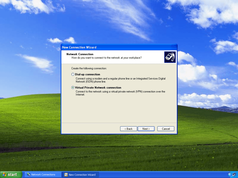 In the next New Connection Wizard window, choose the Virtual Private Network connection option and click Next.