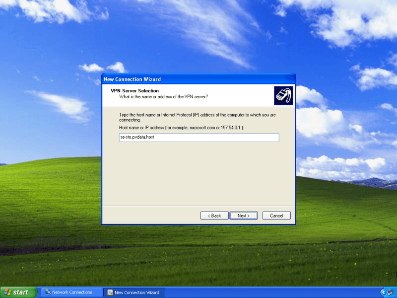 In the VPN Server Selection window, type the PrivateVPN server address into the Host name or IP address box. Click Next.