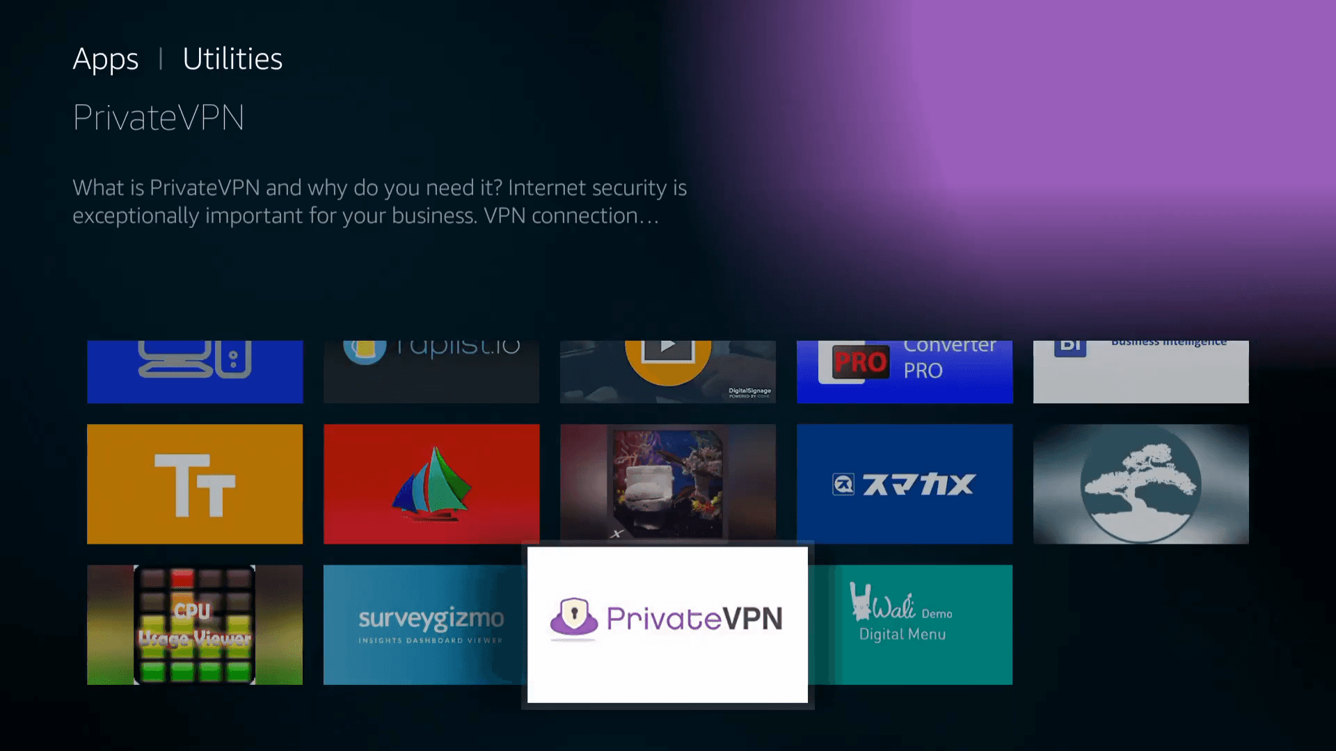 Go to Categories and press on Utility. Scroll down until you find PrivateVPN. Or, you can search for it in the search box. Before installing it, go to PrivateVPN.com and make an account by pressing the Buy button. After you register, enter your details into the app. Then choose a server of your choice, and you are good to go!