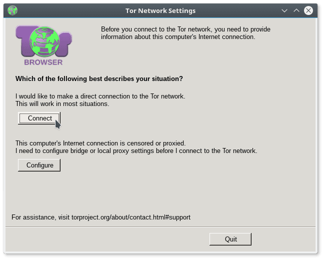 On first run, a dialog box appears asking you to either Connect to Tor or configure it with other settings.
